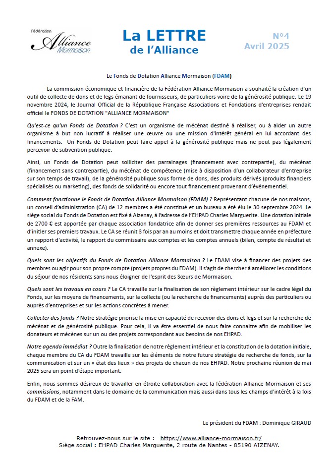 Les administrateurs de la Fédération Alliance Mormaison ainsi que les directeurs et directrices des établissements vous présentent la lettre d’informations qui vous permettra de mieux connaître ce qu’est la Fédération, quelles sont ses actions, ses engagements et les personnes qui, tout au long de l’année, s’y investissent.